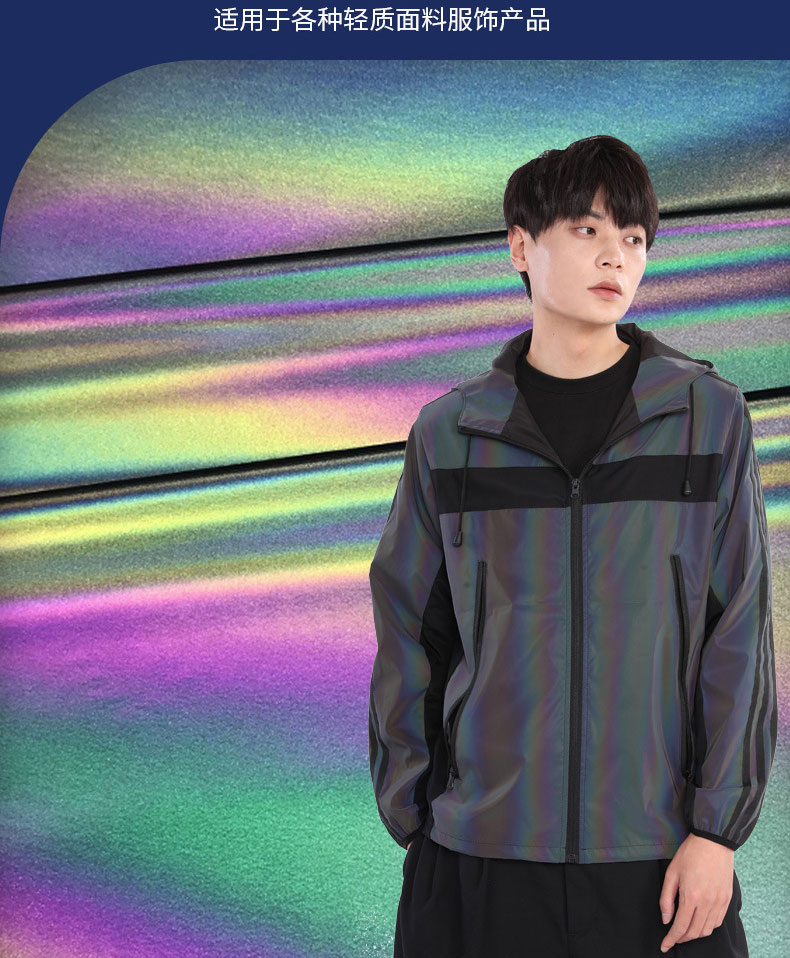 炫彩反光布又稱幻彩/七彩反光布,在夜晚燈光照射下可呈現(xiàn)如彩虹般漸變色,其出色反光性能的同時(shí)又兼顧色彩多樣性,